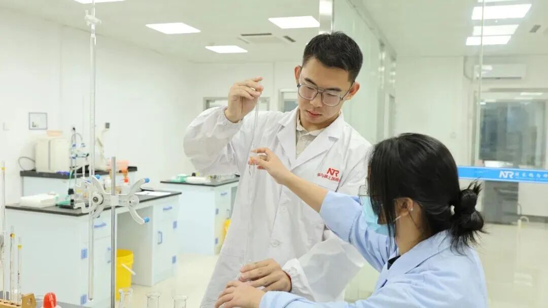 在国家钨与稀土产品质量检验检测中心实验室里,学生们正紧锣密鼓地进行实操训练。他们身着实验服,手持检测仪器,有条不紊地进行样品称量、试剂配制等操作,一派专注高效、学以致用的实践育人景象跃然眼前。