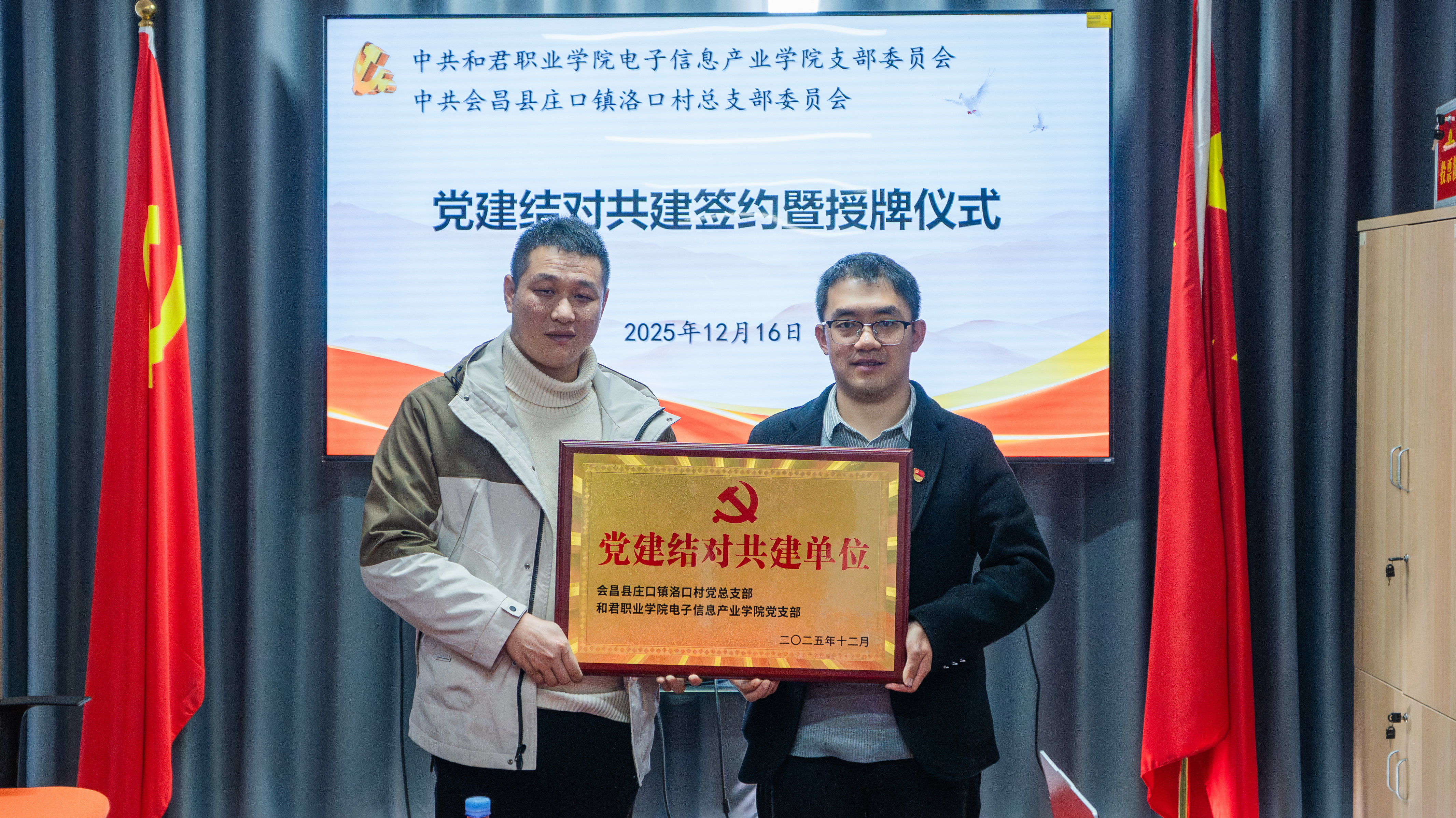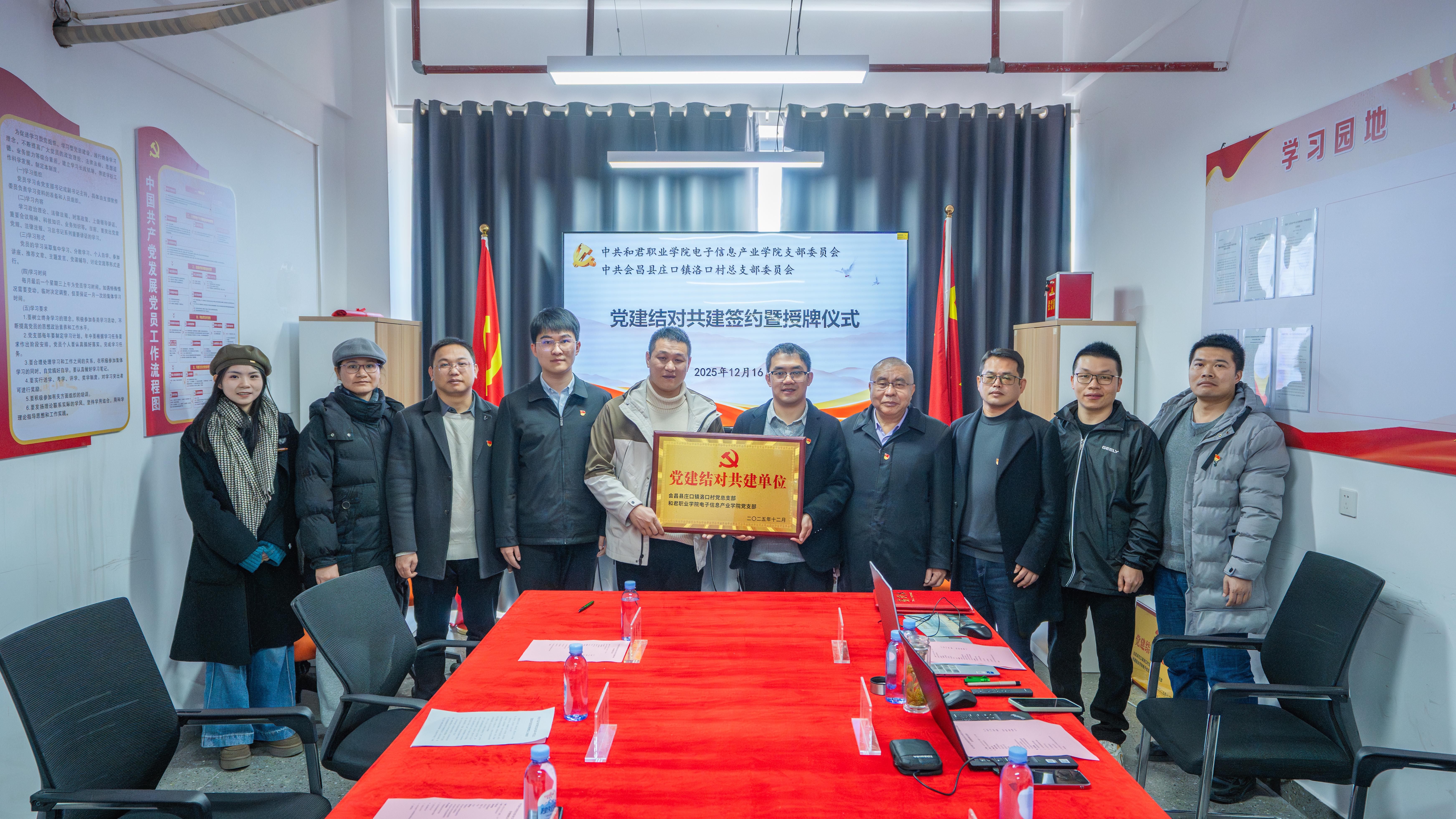 在全体与会人员的见证下,电子信息产业学院党支部书记曹会兵与洛口村党总支书记肖贤平共同签署《党建结对共建协议书》,并互授“党建共建单位”牌匾,标志着双方长期、稳定、务实的合作关系正式确立。
