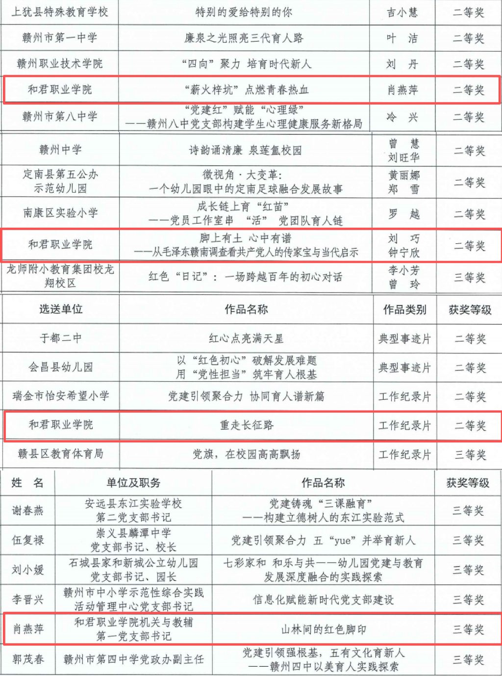 在党务技能优秀案例和党组织书记谈党建活动评选中,肖燕萍的作品《“薪火梓坑”点燃青春热血》《山林间的红色脚印》分别荣获二等奖和三等奖;在干部教育培训好(微)课程评选中,刘巧、钟宁欣共同打造的作品《脚上有土心中有谱》喜获二等奖;党委宣传部拍摄制作的工作纪录片《重走长征路》获评二等奖。