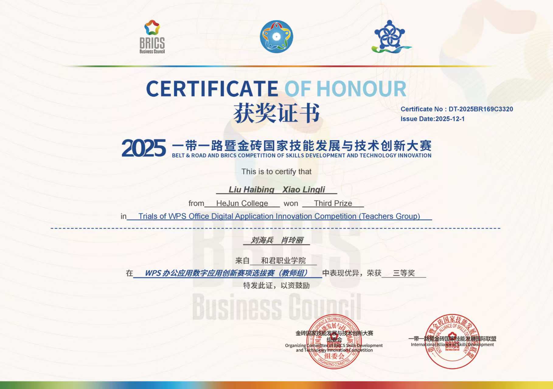 近日,2025“一带一路”暨金砖国家技能发展与技术创新大赛WPS办公应用数字应用创新赛项选拔赛圆满落幕。我校现代服务业产业学院教师刘海兵、肖玲丽凭借扎实的专业功底与创新应用能力,在该赛项教师组中脱颖而出,荣获三等奖。